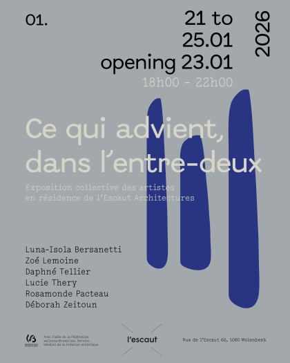 Ce qui advient, dans l’entre-deux réunit les artistes en résidence autour d’une exposition pensée dans le cadre de leur recherche au sein de l’Escaut Architectures, restituant les premiers mois de recherche et d’adaptation. Elle propose une réflexion sur les espaces intermédiaires, les seuils et les zones de transition. L’exposition s’inscrit dans un moment de recherche et de transformation, où les pratiques se rencontrent dans l’entre-deux des médiums.